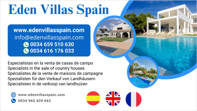 Responsable del tratamiento: Eden Villas Spain, Finalidad del tratamiento: Gestión y control de los servicios ofrecidos a través de la página Web de Servicios inmobiliarios, Envío de información a traves de newsletter y otros, Legitimación: Por consentimiento, Destinatarios: No se cederan los datos, salvo para elaborar contabilidad, Derechos de las personas interesadas: Acceder, rectificar y suprimir los datos, solicitar la portabilidad de los mismos, oponerse altratamiento y solicitar la limitación de éste, Procedencia de los datos: El Propio interesado, Información Adicional: Puede consultarse la información adicional y detallada sobre protección de datos Aquí.
