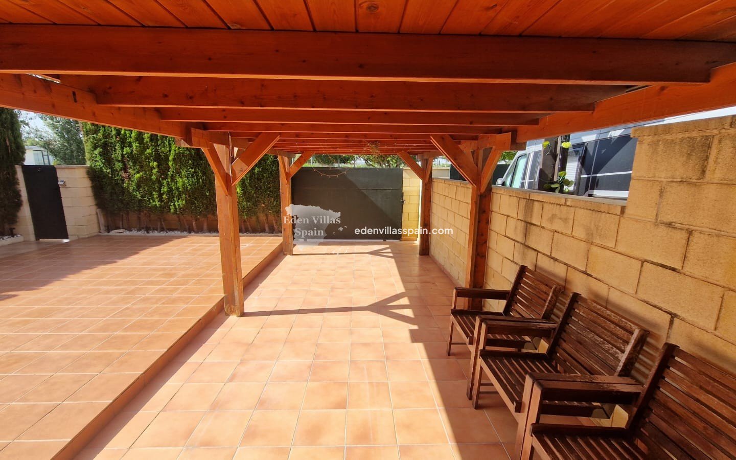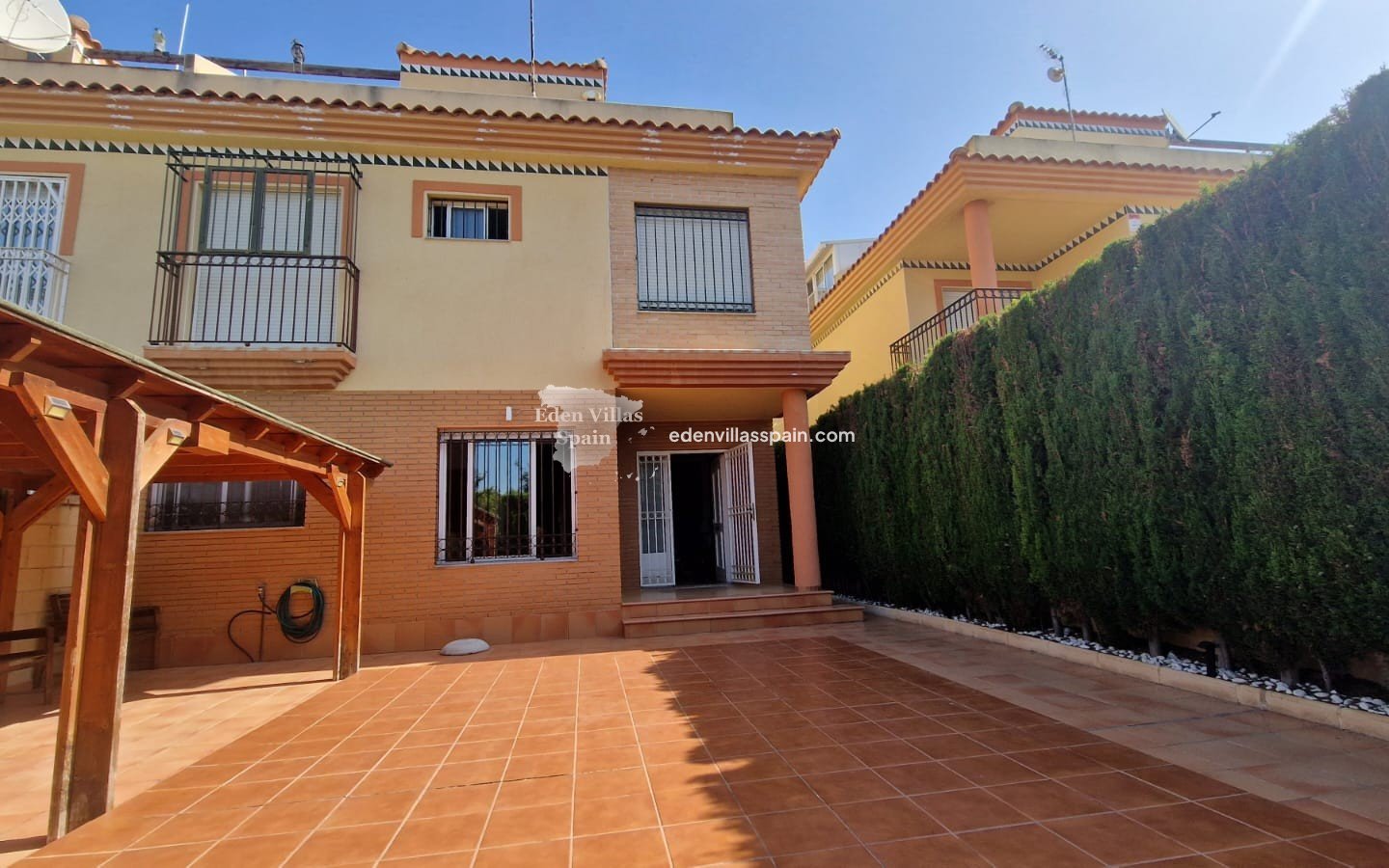 Das Anwesen verfügt über eine 60 m² große, pflegeleichte private Terrasse mit großer, gepflasterter Terrasse, einer großen Pergola/einem Carport für Schatten im Sommer und einem privaten Parkplatz. Nur wenige Meter entfernt befindet sich ein Gemeinschaftspool.