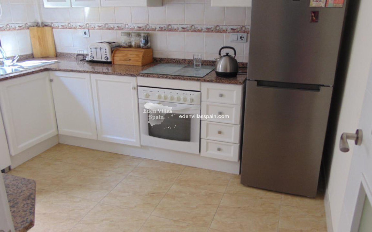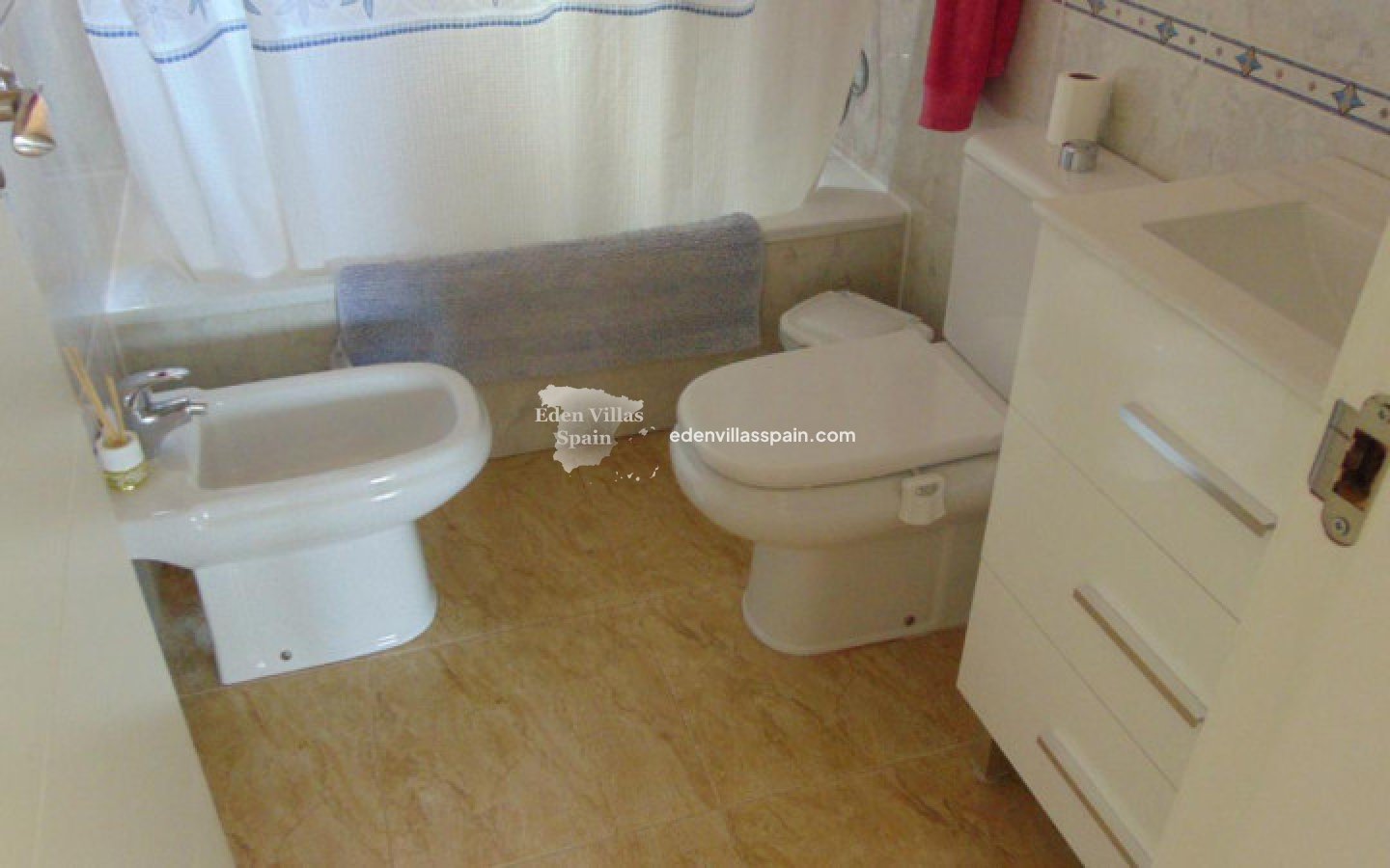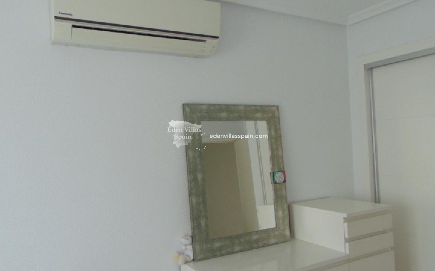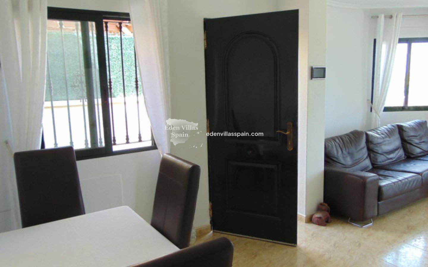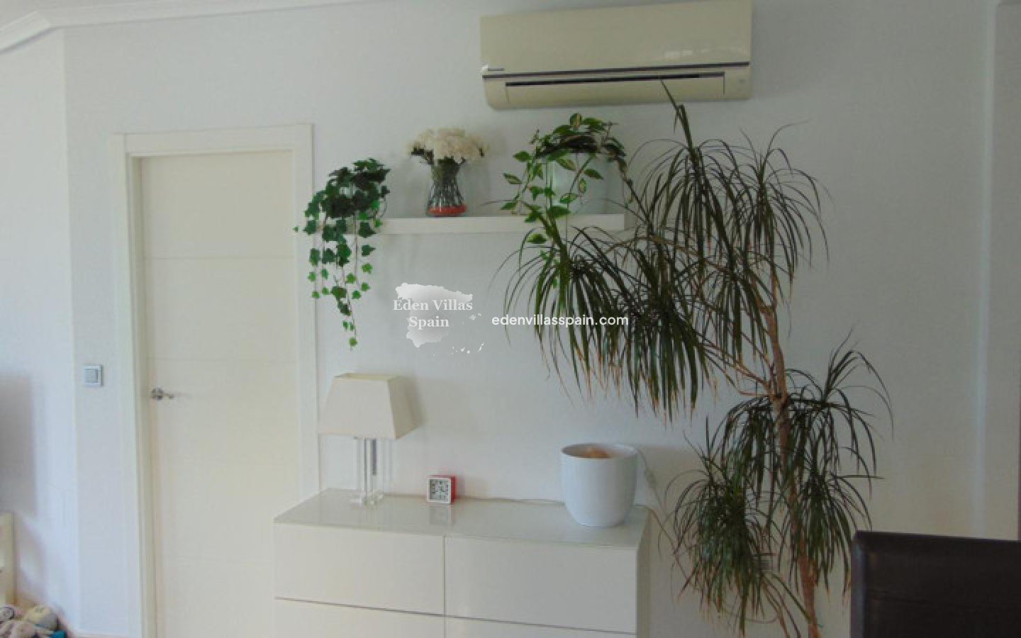 Se ingresa a la propiedad en un espacioso salón-comedor con aire acondicionado instalado y puertas de patio a la terraza solárium. Hay una cocina independiente bien equipada con una puerta de acceso trasera al área de la piscina o la escalera del solárium. Hay dos dormitorios de invitados con armarios empotrados y aire acondicionado instalado. Tiene un baño familiar con bañera y ducha, además de un dormitorio principal de buen tamaño con armarios empotrados, aire acondicionado y un maravilloso baño en suite (ducha a ras de suelo, lavabo e inodoro).