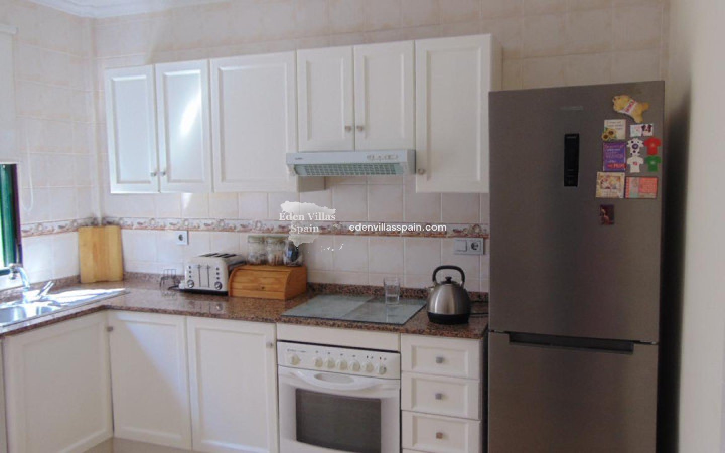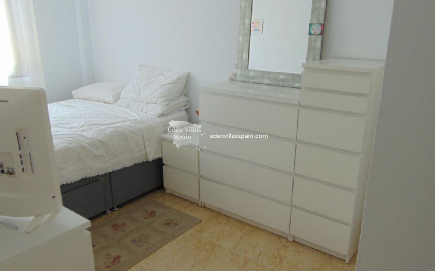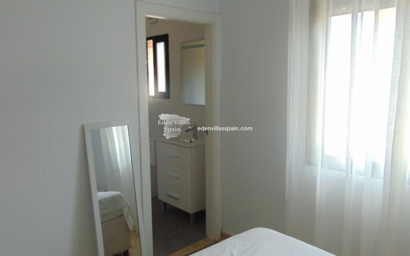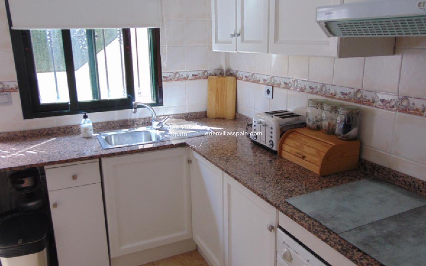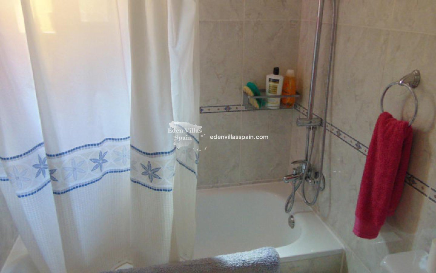Se ingresa a la propiedad en un espacioso salón-comedor con aire acondicionado instalado y puertas de patio a la terraza solárium. Hay una cocina independiente bien equipada con una puerta de acceso trasera al área de la piscina o la escalera del solárium. Hay dos dormitorios de invitados con armarios empotrados y aire acondicionado instalado. Tiene un baño familiar con bañera y ducha, además de un dormitorio principal de buen tamaño con armarios empotrados, aire acondicionado y un maravilloso baño en suite (ducha a ras de suelo, lavabo e inodoro).