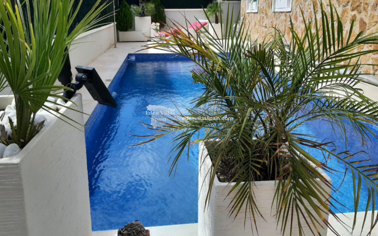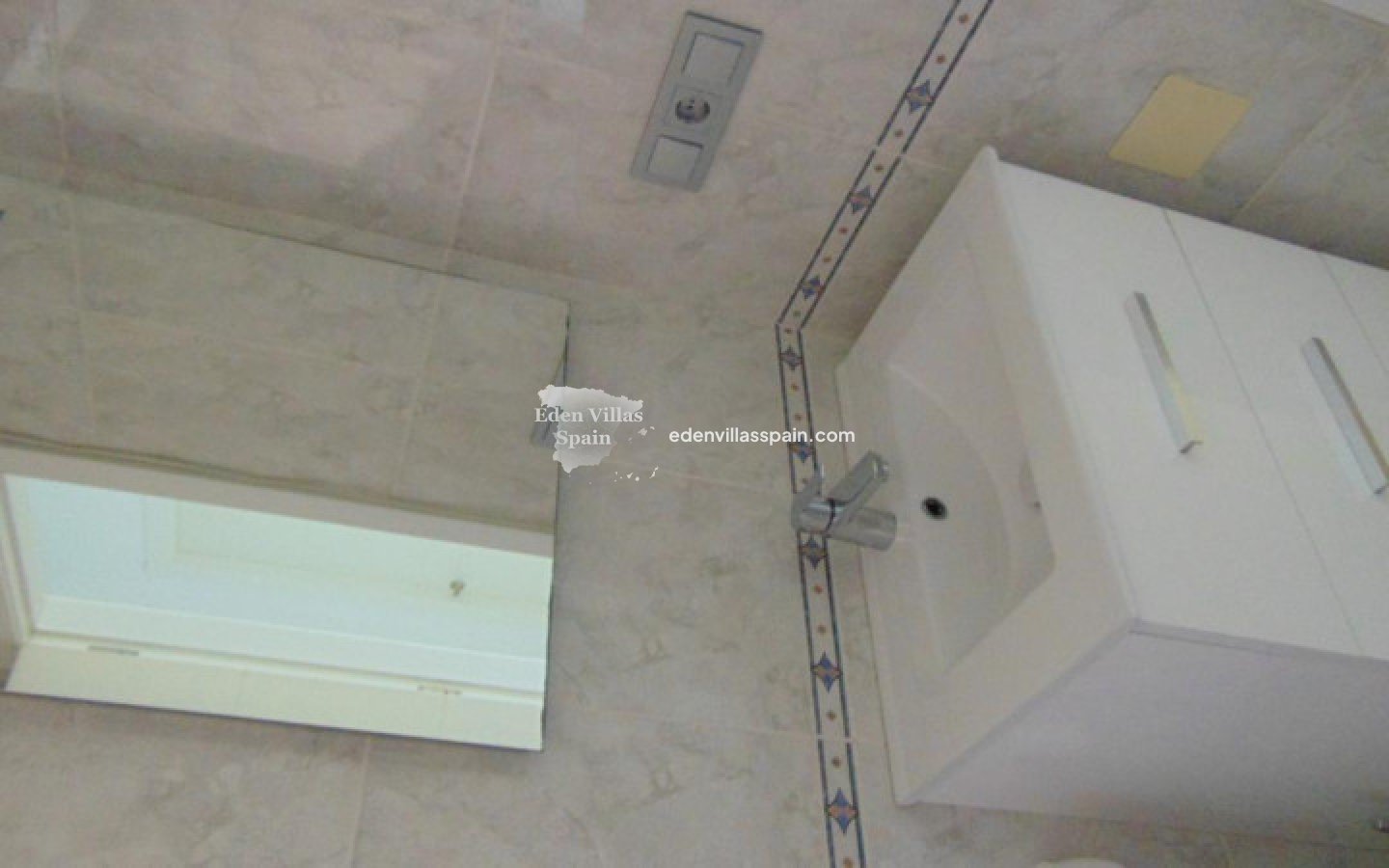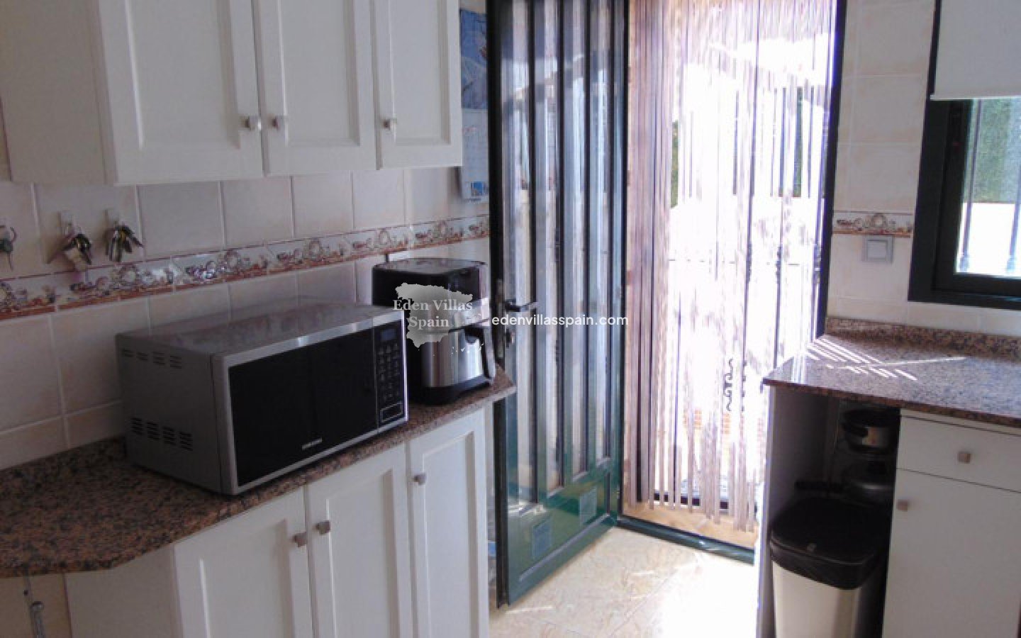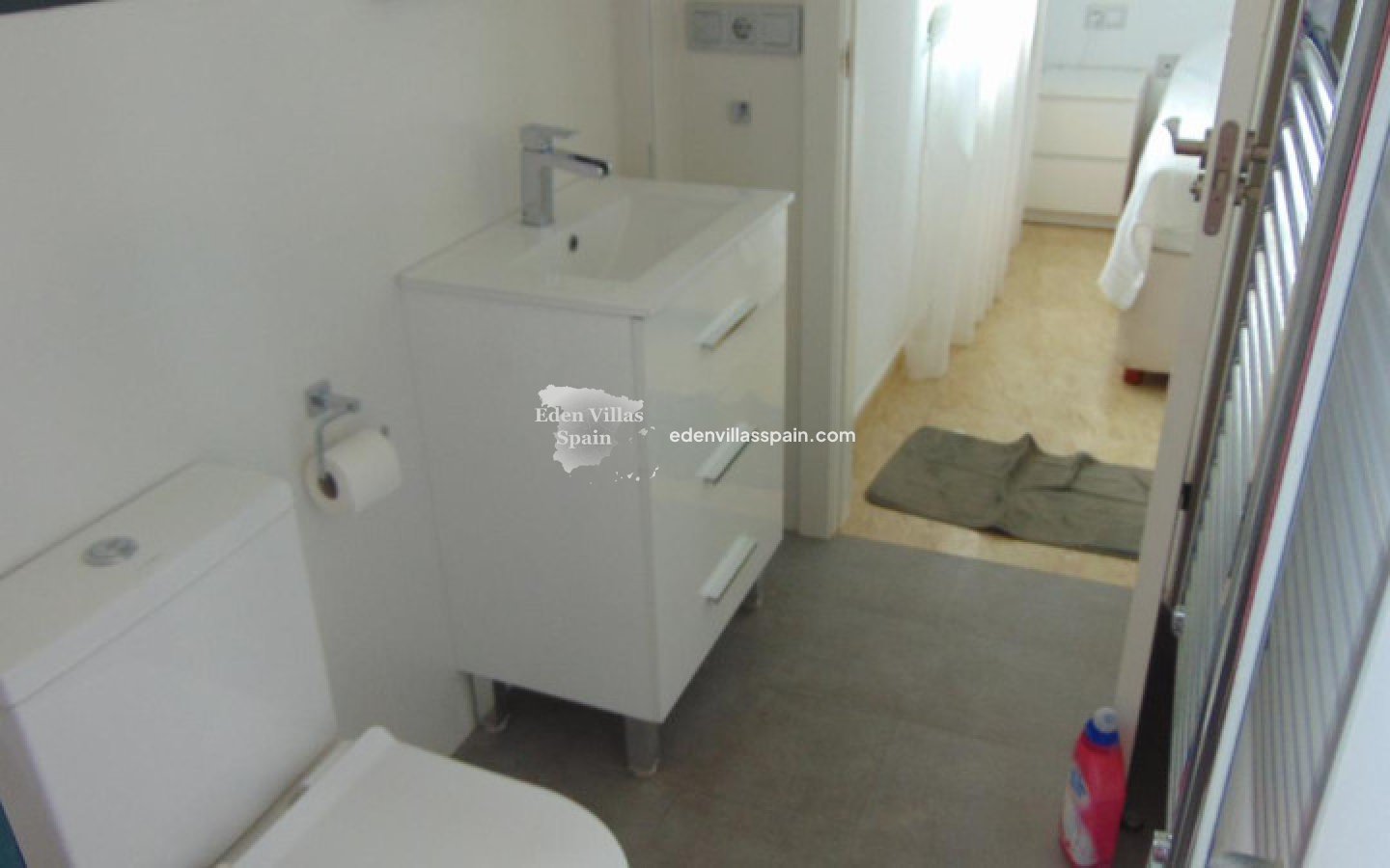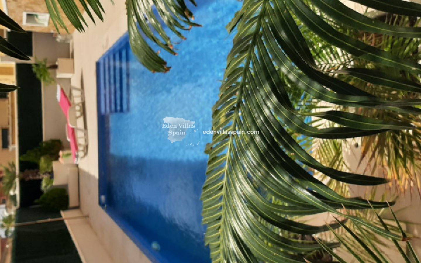 Se ingresa a la propiedad en un espacioso salón-comedor con aire acondicionado instalado y puertas de patio a la terraza solárium. Hay una cocina independiente bien equipada con una puerta de acceso trasera al área de la piscina o la escalera del solárium. Hay dos dormitorios de invitados con armarios empotrados y aire acondicionado instalado. Tiene un baño familiar con bañera y ducha, además de un dormitorio principal de buen tamaño con armarios empotrados, aire acondicionado y un maravilloso baño en suite (ducha a ras de suelo, lavabo e inodoro).
