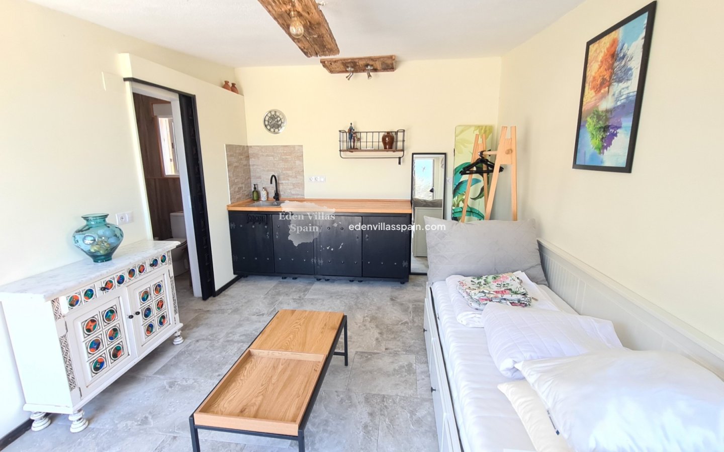 La maison principale comprend un grand séjour avec poêle à granulés, une grande cuisine entièrement équipée avec un grand espace repas avec une grande table, un salon séparé pour se détendre et un cellier (le séjour et la cuisine communiquent par deux espaces ouverts pour une parfaite intégration), deux chambres avec placards intégrés, deux salles de bains (dont une attenante), une terrasse avec balustrades et un toit-terrasse ou solarium avec vue panoramique et coin repas pour profiter de la vue. La chambre principale dispose d'une salle de douche intégrée et d'une porte-fenêtre donnant sur la terrasse.