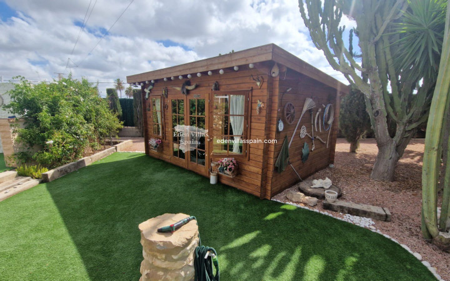Ook op het perceel bevindt zich een houten huis dat wordt gebruikt als hobbyruimte en dat ook kan worden omgebouwd tot meer woonkamer of extra slaapkamer.